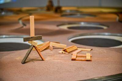 在看到土的原初与多种可变形态,了解土的特性,见识到土的丰富用途后,我们还能用土做什么? 第五篇章“多多接触土!”让观众可以自己动手与土亲密互动。KUMO创作的装置作品《心之所响的“土”的音乐》 把土封入玻璃管子里,50根不同土量的玻璃管排成直径3米的圆,观众可以用配套鼓槌,敲击出各种音色,聆听“土”的声音。另一件互动装置《心之所向的“土”的风景》由KUMO与 畑中久美子合作创作 ,直径超过6米的巨型圆盘桌上,一侧矗立着东方明珠、金茂大厦、上海中心大厦等上海标志性建筑的土制模型,蜿蜒镜面象征黄浦江,正是我们所生活的这片土地。桌面上大量留白的“土地”,等待着观众用从中国各地采集的丰富多彩的“土”染制成的圆柱体和木条,一起构建你心目中的城市建筑风景,成为这件作品的共创者之一。(工具使用需预约,请关注明珠美术馆PAM微信号信息。)