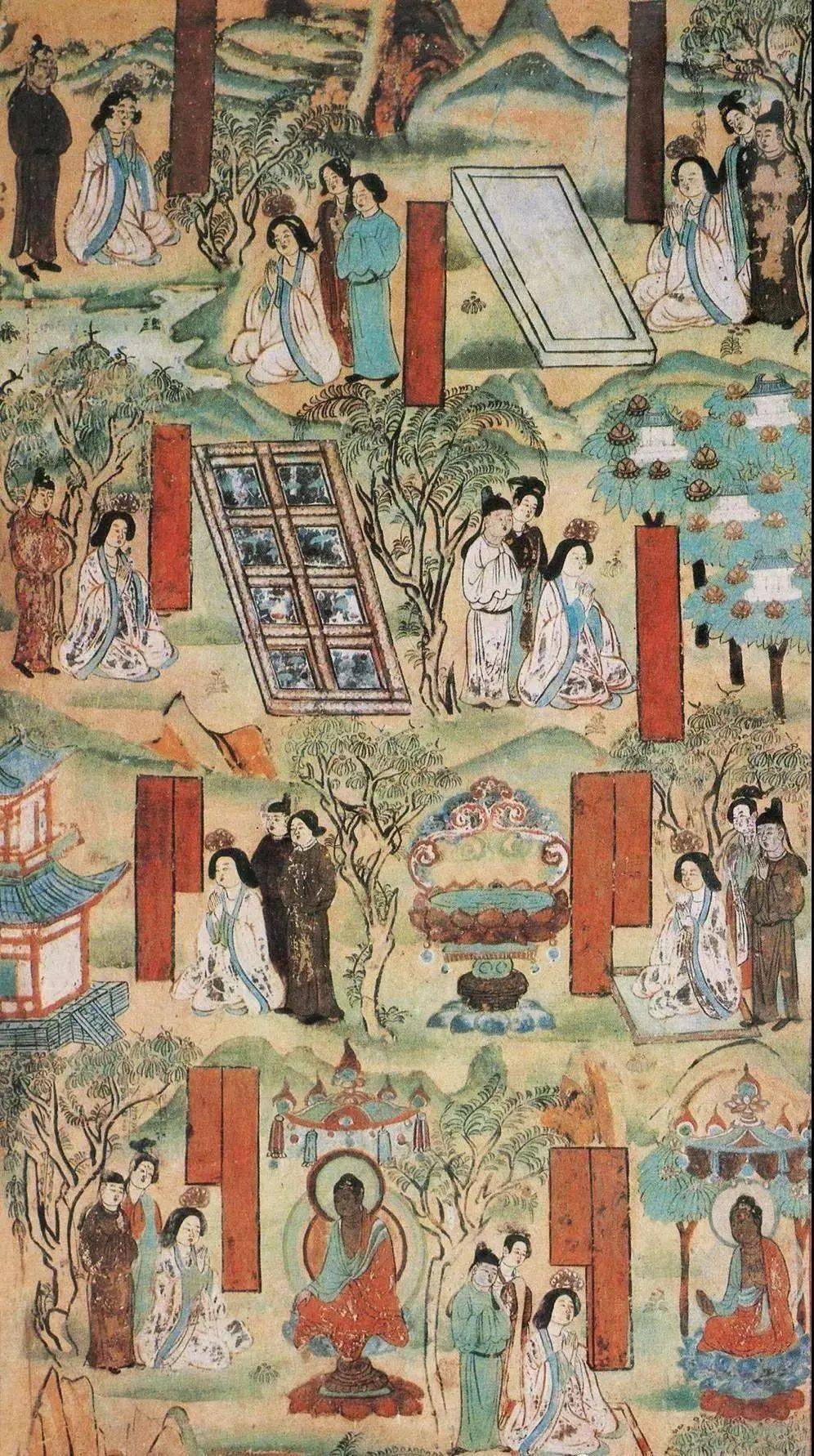 敦煌位于河西走廊的最西端,是古代中原地区与西域交通往来的必经之地,也是诸多民族杂居之地,自古便是多元文化交融、碰撞的地方。公元前6至前5世纪,佛教于古印度创建,后于汉明帝时期经由西域传至中原地区。敦煌受佛教文化的影响,结合华夏文明孕育出灿烂多彩的敦煌文化,并诞生了以敦煌石窟为主要载体的佛教艺术。敦煌壁画即绘制在敦煌石窟内壁的绘画作品,其规模大,内容丰富,被视为世界上最大的艺术宝库之一。